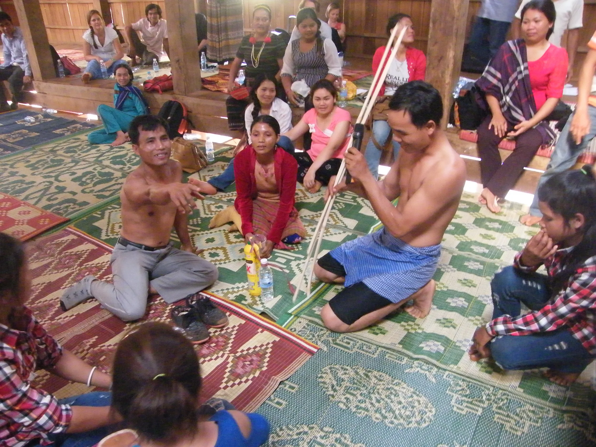 Role play of community forest protection patrol during an Outcome Harvest in Cambodia. OH first asks who is behaving differently, how and why then tries to unravel what the project contributed.